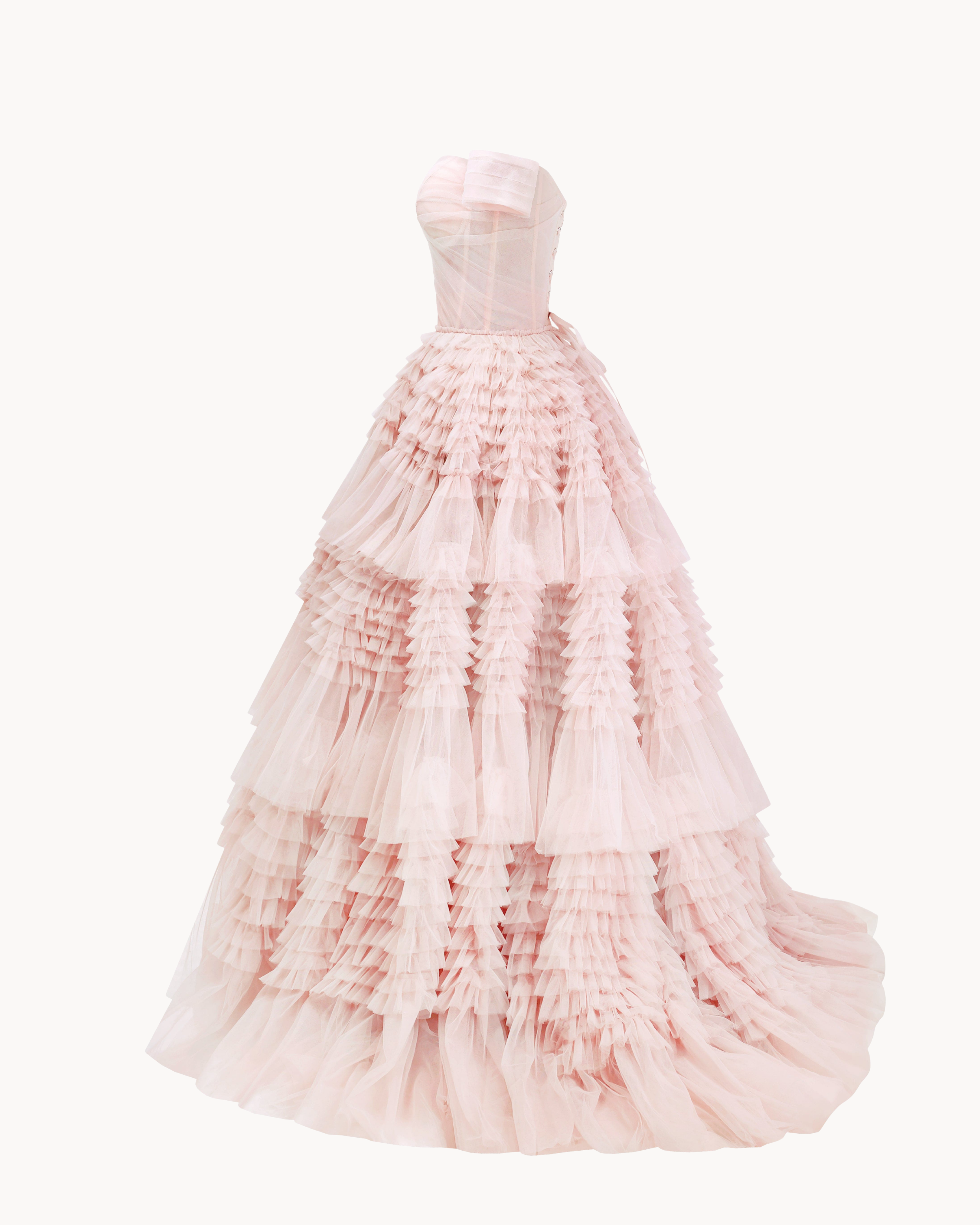 designed to emphasize the shoulders and arm lines. The ruched tulle bodice is complemented with the frill-layered maxi tulle skirt.