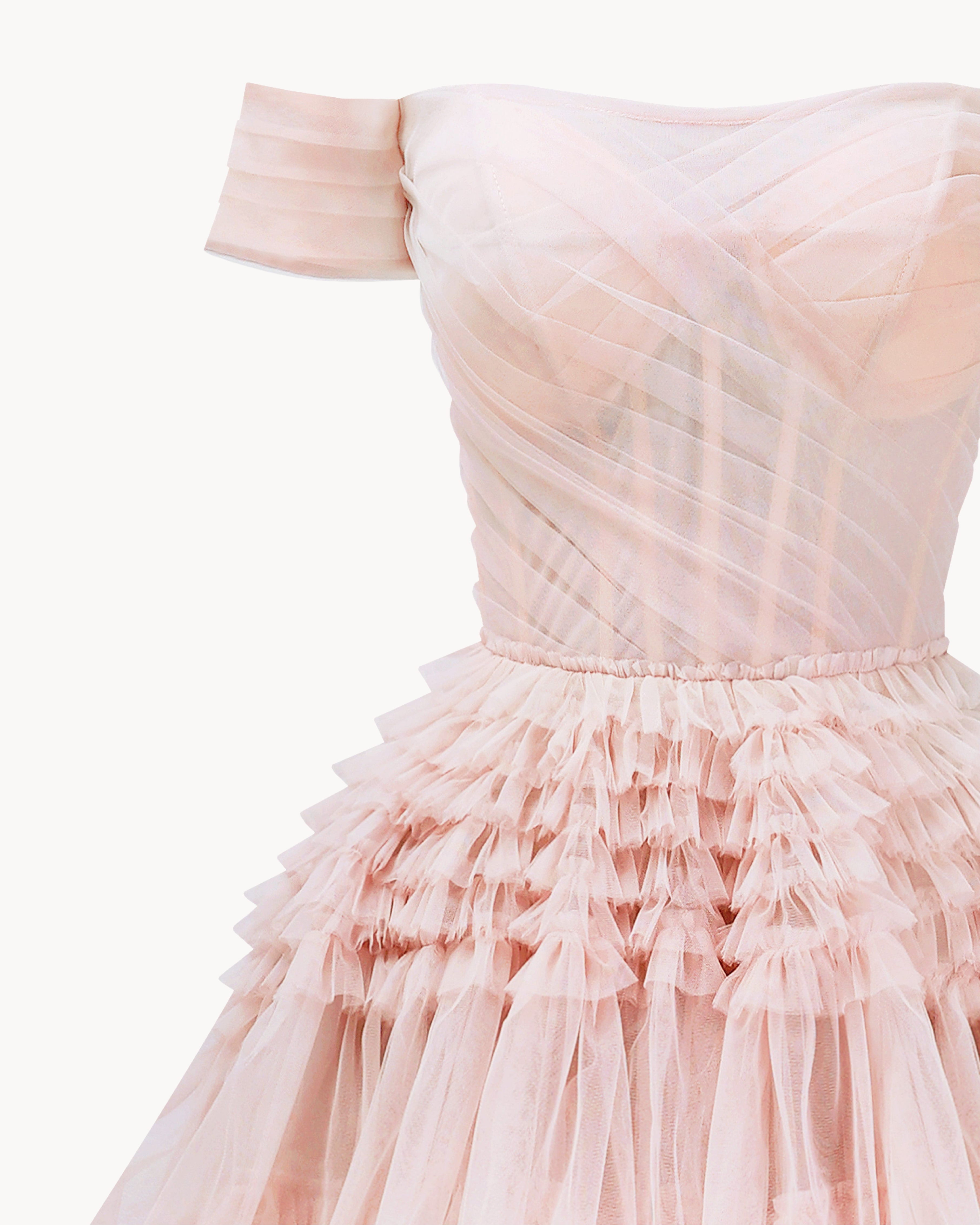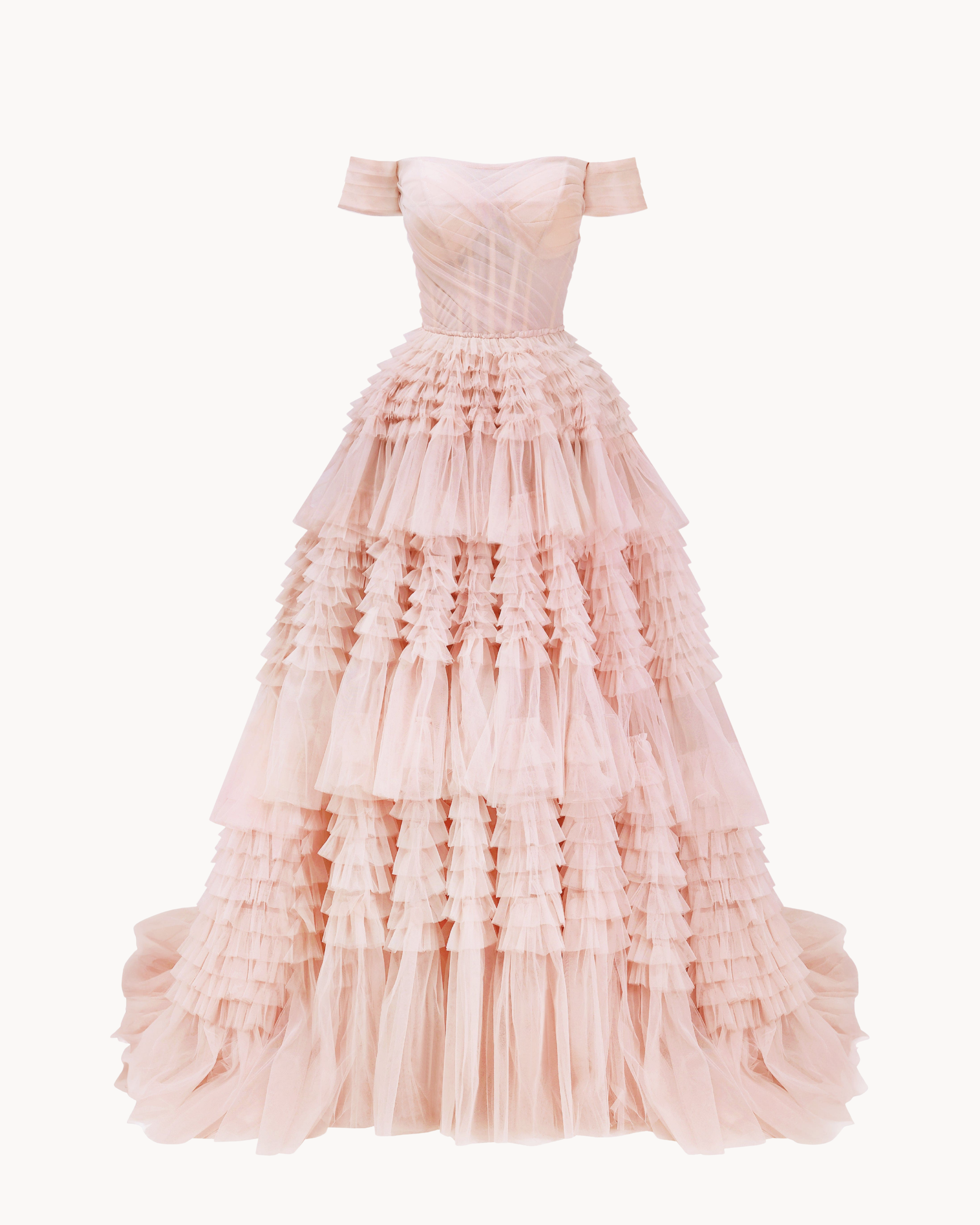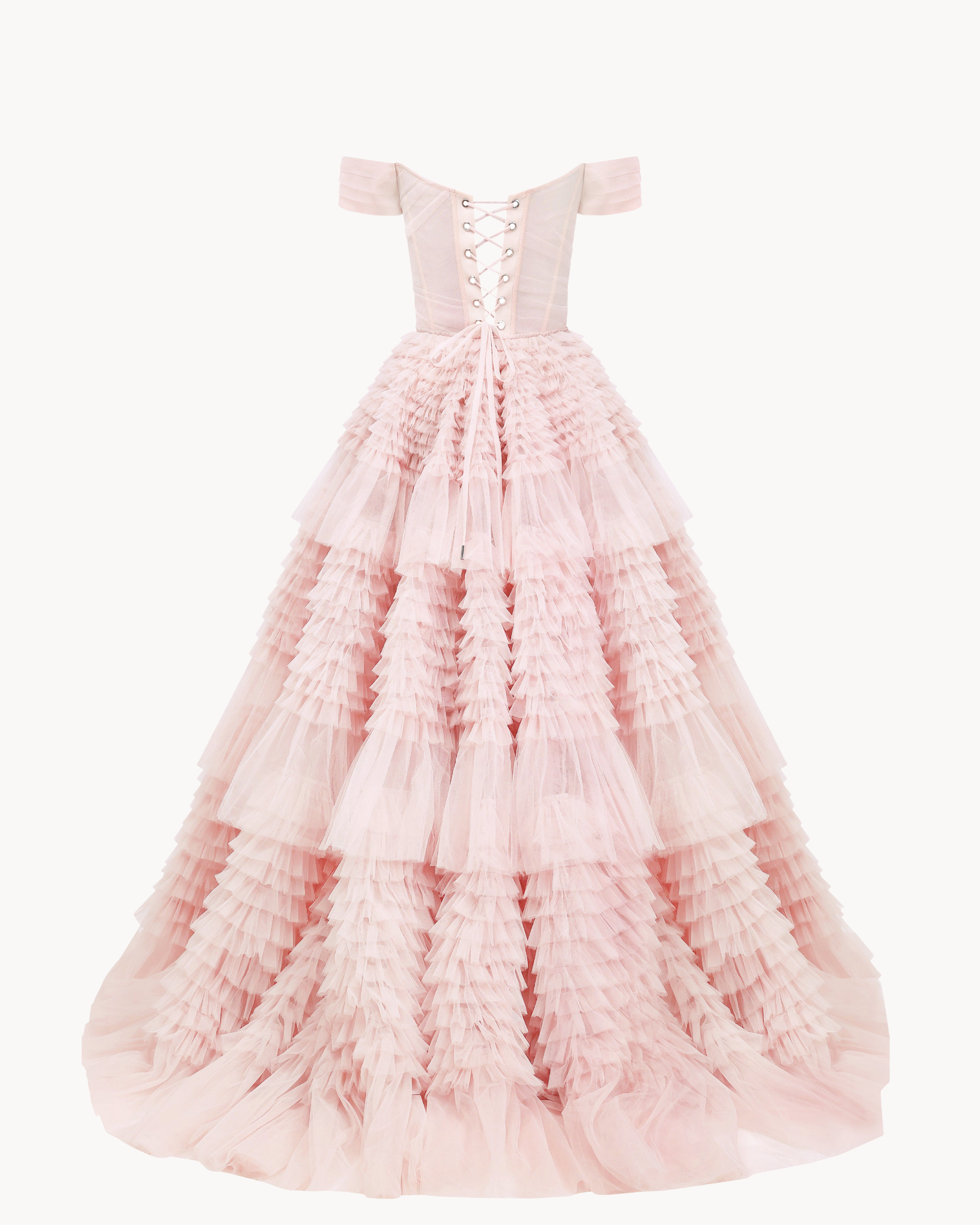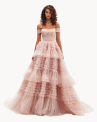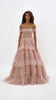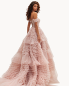 Misty Rose Off-The-Shoulder Frill-Layered Gown