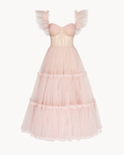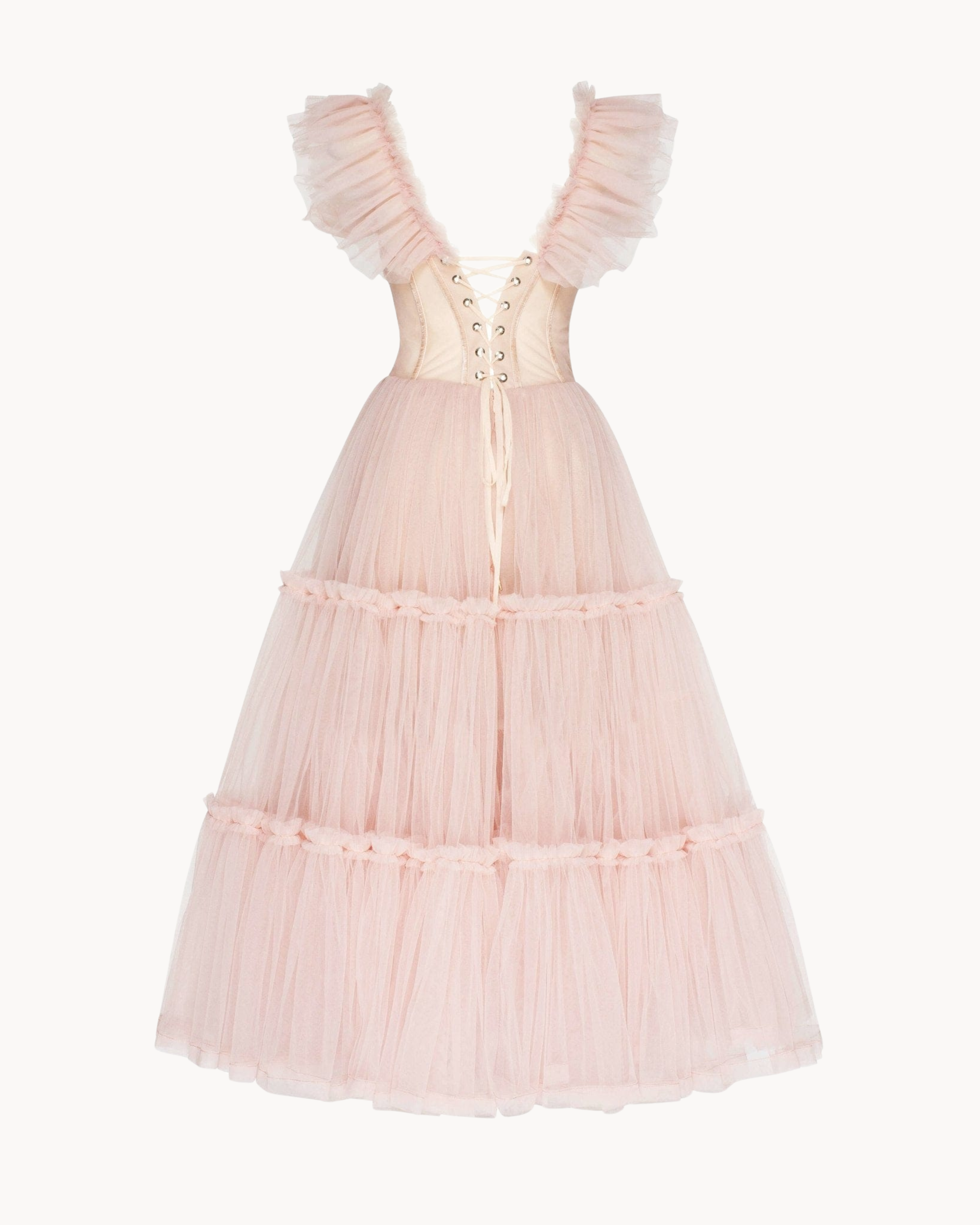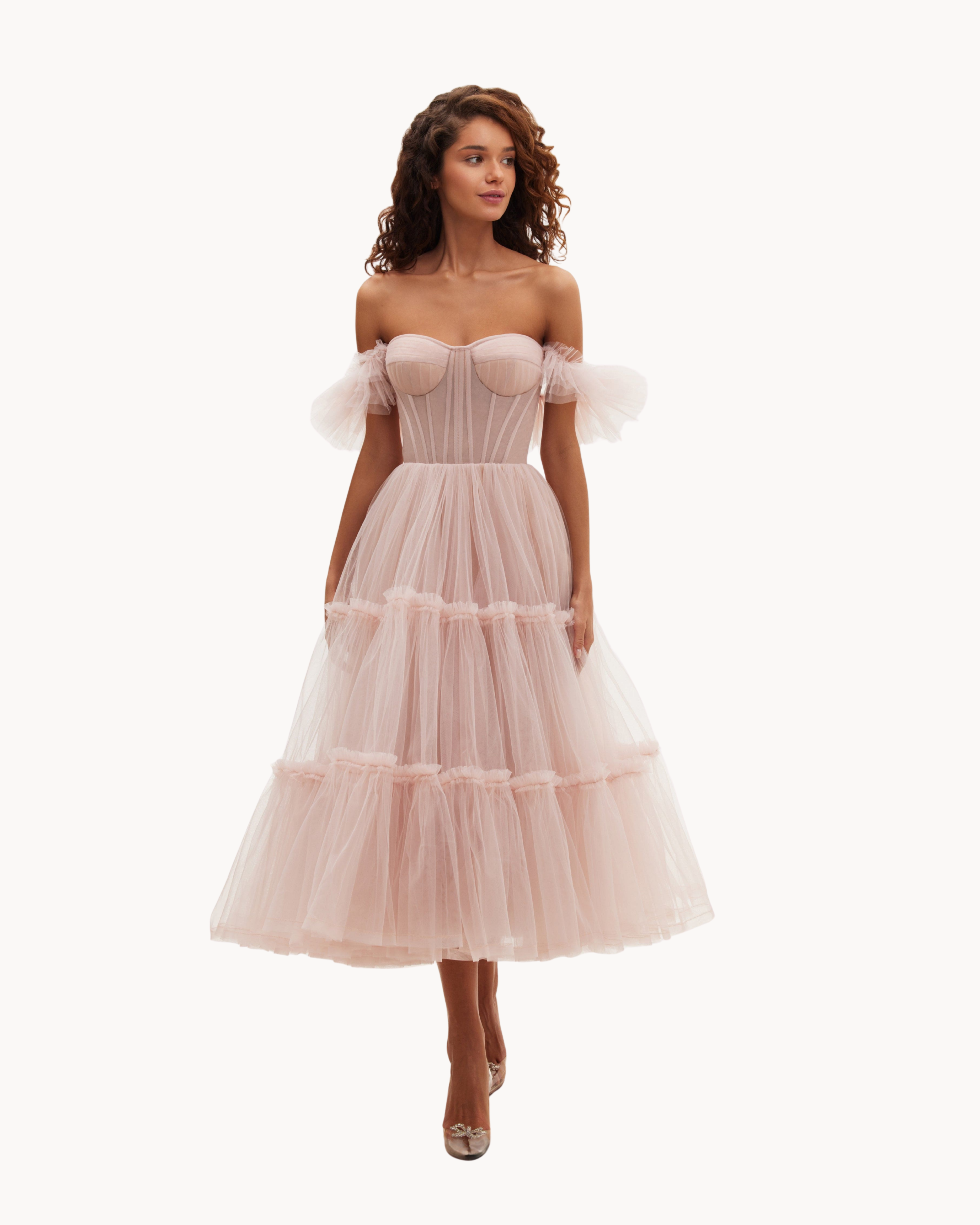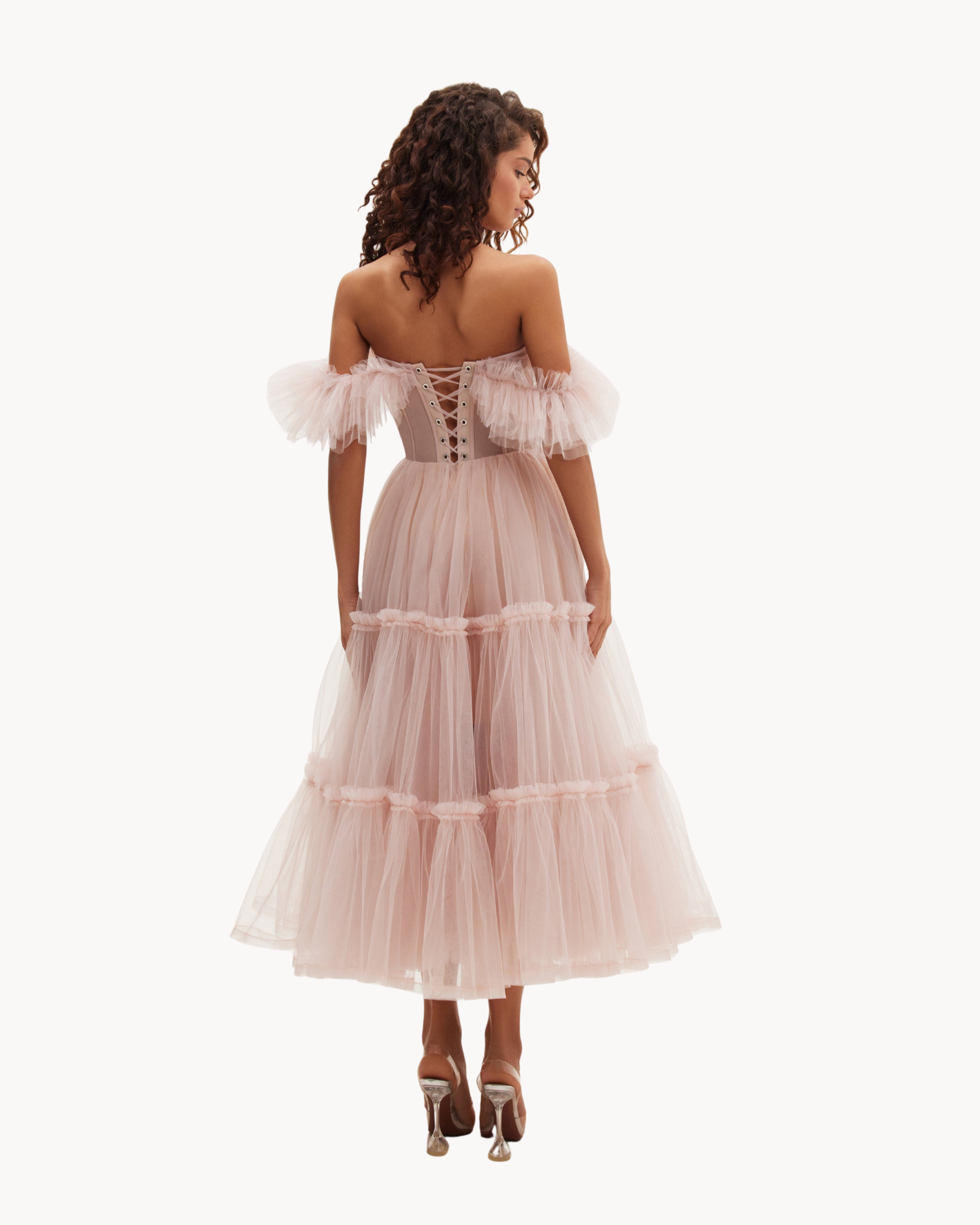 The cocktail dress is made from tulle. The bustier is semi-transparent and has corset lacing on the back. The dress is decorated with ruffle sleeves. The tulle skirt is partially lined.